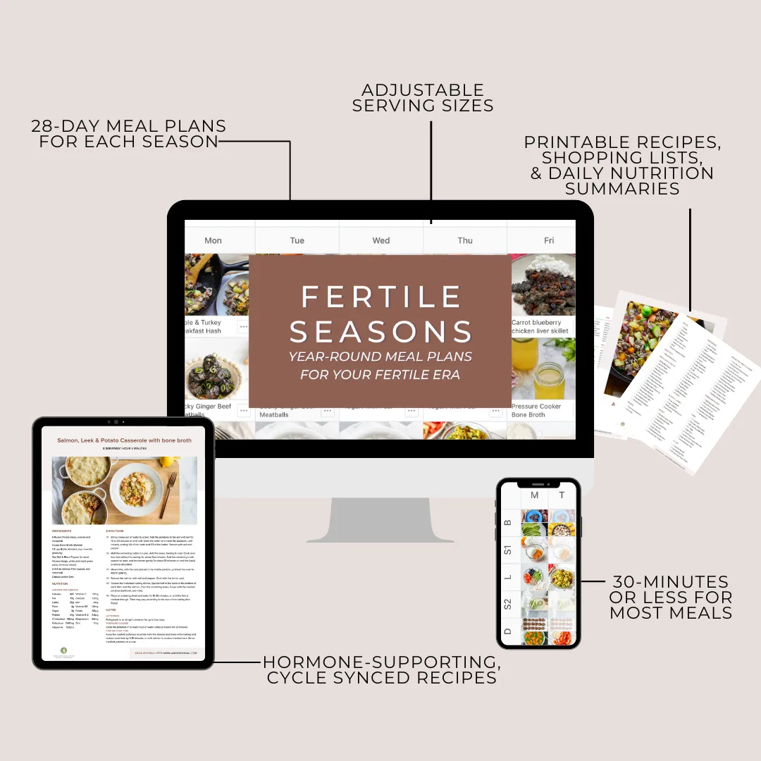 Fertile Seasons gives you done-for-you seasonal meal plans that help you go from overwhelmed and undernourished… to confident, satisfied, and fully supported with food that’s designed to help you eat for hormone health, egg quality, and cycle balance — all year long.